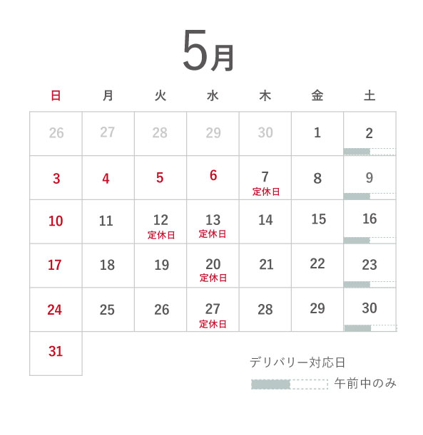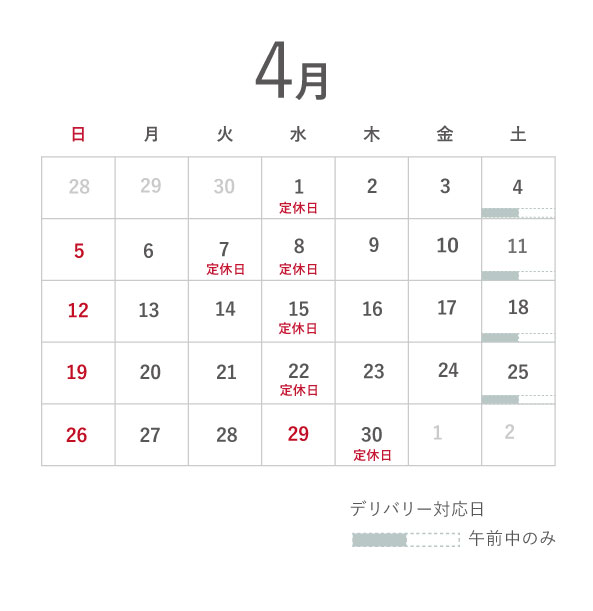 4・5月の営業日のお知らせ 営業時間 平日 / 10:30~18:00 土日祝 / 10:30~18:30 定休日 / 水曜日・第1火曜日 ※4/29(水)は祝日のため営業、4/30(木)が定休日となります。 ※5/5(火)、5/6(水)は祝日のため営業、5/7(木)、5/12(火)が定休日となります。